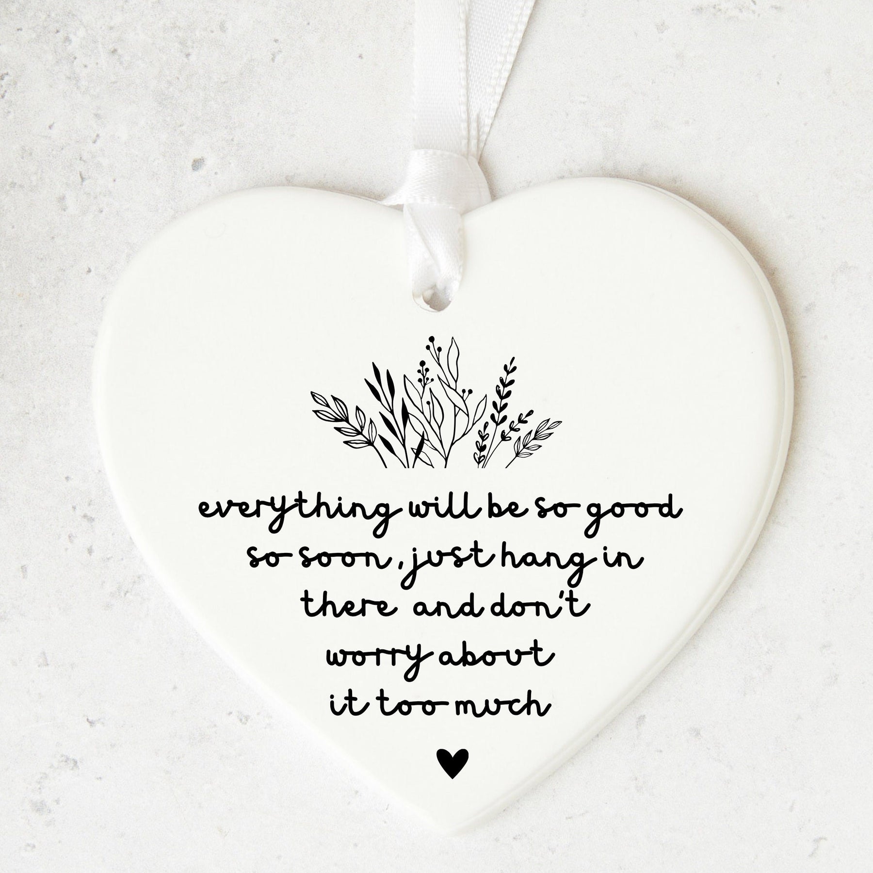 Introducing our Heart-Shaped Ceramic Hanging Keepsake! This beautifully crafted plaque features an uplifting message, 'Everything will be so good so soon, just hang in there and don’t worry about it too much,' encased in a heart-shaped design adorned with a delicate botanical flower. Perfect for gifting or as a reminder of hope and resilience, this charming keepsake brings positivity and encouragement to any space.